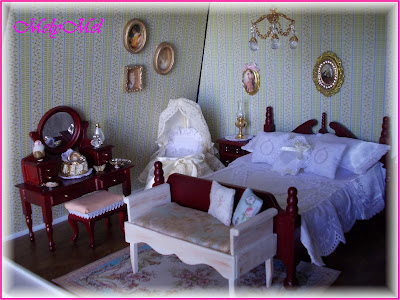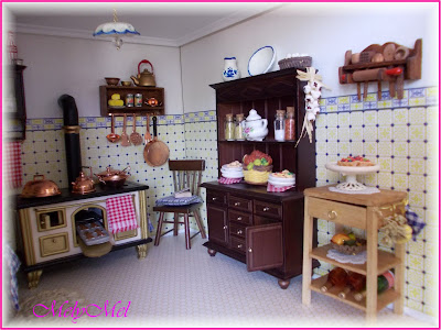 Le due sedie il tavolo e la credenza sono sempre pezzi originali, il catino con brocca il piatto con le uova e quello con i biscotti sono fatti da me, così come la treccia d’aglio...immancabile persino nella mia casa vera!! Ma anche quella è fatta da me, in scala 1:1, non sopporto l’odore dell’aglio...