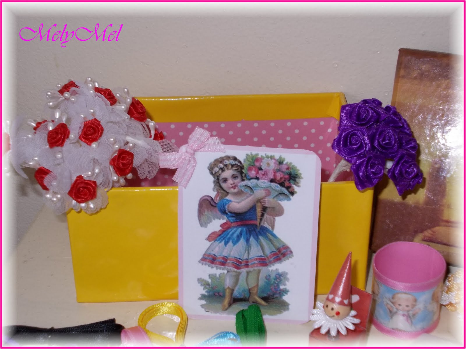 E poi ancora un piccolo specchio, una boccettina di profumo ed un cestino, che contiene alcuni oggetti personali di Sara ( la ricordate?... potete ammirarla nel post dedicato ai regali che Patty mi ha donato), tra cui un cammeo appartenuto alla nonna, alcune cartoline floreali con versi scritti dal suo grande amore e delle saponette profumate...lei come me adora tenerle nei cassetti per profumare la sua biancheria!
