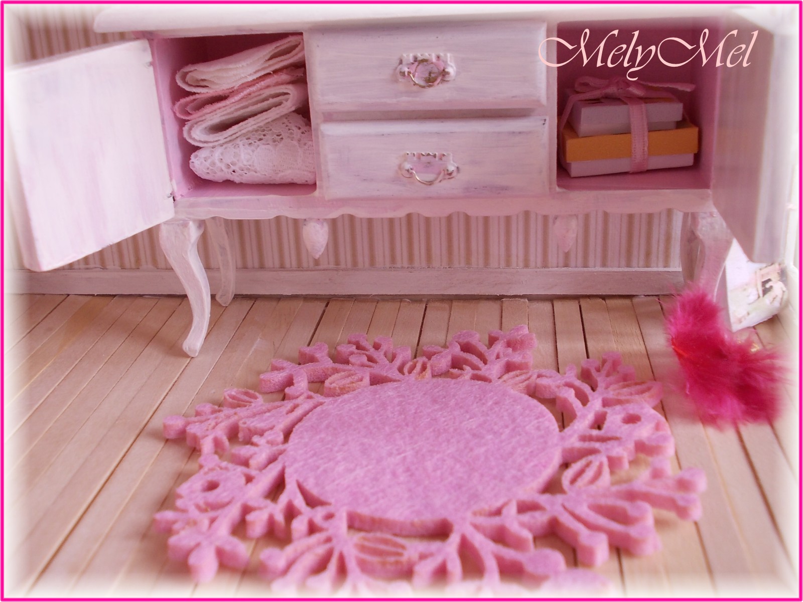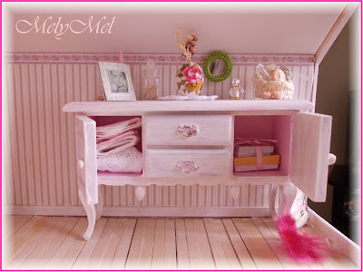 Quello che vedete nelle foto sotto è il primo mobile che entra nella casetta, non l’ho costruito io, gli ho solo cambiato aspetto per adattarlo alla camera da letto che sarà interamente costruita da me e che avrà gli stessi toni di bianco e rosa, per uno stile un po’ shabby, un po’ decapè. Il mobile nella sua versione originale potete osservarlo nella sala da pranzo della casa vittoriana, li acquistai entrambi per 1 euro e sapevo che prima o poi avrei usato anche l’altro. Quando li osservo trovo incredibile come un semplice tocco di colore possa trasformare una cosa in un’altra totalmente diversa! Voi che dite?