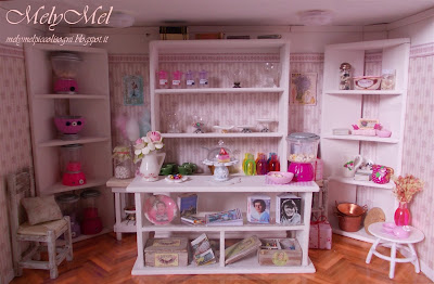 Mely que tienda tan dulce! Ay! me gusta todo, se nota el mimo con que has hecho cada detalle... me encantan las maquinas para los chichles y esas jarras floreadas son delicadas y preciosas. Mariajo